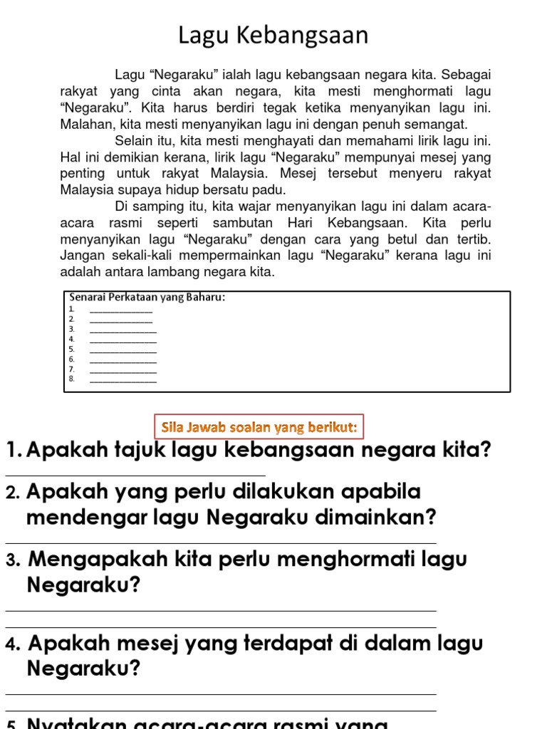 . Kita perlu mengenali serta menghormati raja dan pemimpin negara kita kerana mereka yang berusaha mengekalka keamanan dan kesejahteraan negara. 1 - Haleluya Pujilah Kidung Jemaat 1-478. Pada waktu perhimpunan murid dididik untuk menghormati lagu Negaraku dengan berdiri tegak dan menyanyikannya dengan penuh semangat.